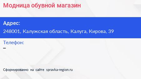 Модница, обувной магазин по адресу 248001, Калужская область, Калуга, Кирова, 39 в дальнейшем Организация, размещена в следующих категориях: