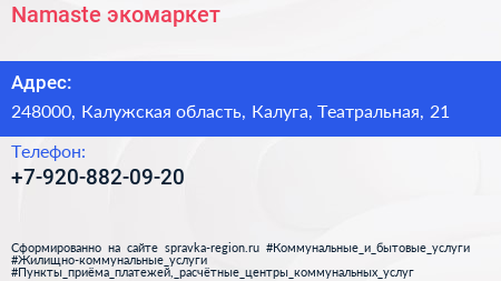 Namaste, экомаркет по адресу 248000, Калужская область, Калуга, Театральная, 21 в дальнейшем Организация, размещена в следующих категориях: