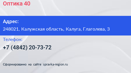 Оптика 40 по адресу 248021, Калужская область, Калуга, Глаголева, 3 в дальнейшем Организация, размещена в следующих категориях: