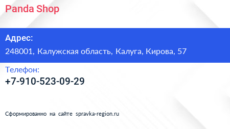 Panda Shop по адресу 248001, Калужская область, Калуга, Кирова, 57 в дальнейшем Организация, размещена в следующих категориях: