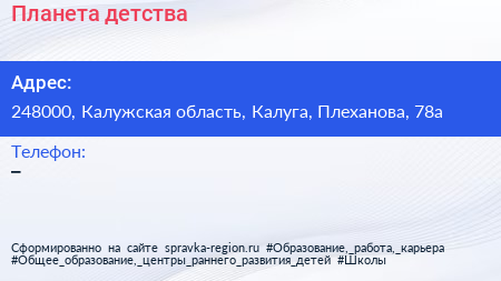 Планета детства по адресу 248000, Калужская область, Калуга, Плеханова, 78а в дальнейшем Организация, размещена в следующих категориях: