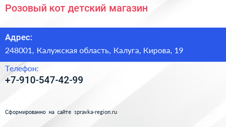 Розовый кот, детский магазин по адресу 248001, Калужская область, Калуга, Кирова, 19 в дальнейшем Организация, размещена в следующих категориях: