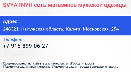 SVYATNYH, сеть магазинов мужской одежды по адресу 248021, Калужская область, Калуга, Московская, 254 в дальнейшем Организация, размещена в следующих категориях: