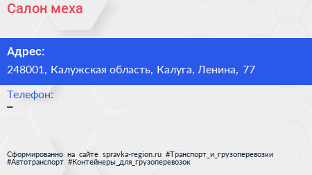 Салон меха по адресу 248001, Калужская область, Калуга, Ленина, 77 в дальнейшем Организация, размещена в следующих категориях: