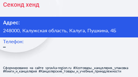 Секонд-хенд по адресу 248000, Калужская область, Калуга, Пушкина, 4Б в дальнейшем Организация, размещена в следующих категориях:
