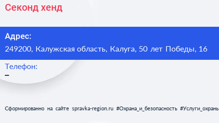 Секонд-хенд по адресу 249200, Калужская область, Калуга, 50 лет Победы, 16 в дальнейшем Организация, размещена в следующих категориях: