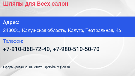 Шляпы для Всех, салон по адресу 248001, Калужская область, Калуга, Театральная, 4а в дальнейшем Организация, размещена в следующих категориях: