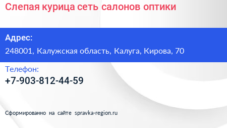 Слепая курица, сеть салонов оптики по адресу 248001, Калужская область, Калуга, Кирова, 70 в дальнейшем Организация, размещена в следующих категориях: