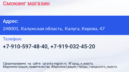 Смокинг, магазин по адресу 248001, Калужская область, Калуга, Кирова, 47 в дальнейшем Организация, размещена в следующих категориях: