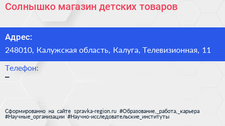 Солнышко, магазин детских товаров по адресу 248010, Калужская область, Калуга, Телевизионная, 11 в дальнейшем Организация, размещена в следующих категориях:
