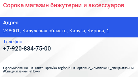 Сорока, магазин бижутерии и аксессуаров по адресу 248001, Калужская область, Калуга, Кирова, 1 в дальнейшем Организация, размещена в следующих категориях: