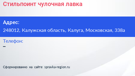 Стильпоинт, чулочная лавка по адресу 248012, Калужская область, Калуга, Московская, 338а в дальнейшем Организация, размещена в следующих категориях: