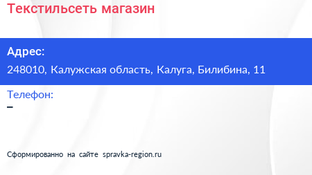 Текстильсеть, магазин по адресу 248010, Калужская область, Калуга, Билибина, 11 в дальнейшем Организация, размещена в следующих категориях: