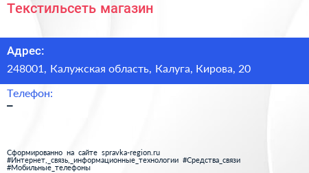 Текстильсеть, магазин по адресу 248001, Калужская область, Калуга, Кирова, 20 в дальнейшем Организация, размещена в следующих категориях: