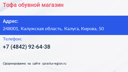 Тофа, обувной магазин по адресу 248001, Калужская область, Калуга, Кирова, 50 в дальнейшем Организация, размещена в следующих категориях: