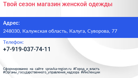 Твой сезон, магазин женской одежды по адресу 248030, Калужская область, Калуга, Суворова, 77 в дальнейшем Организация, размещена в следующих категориях: