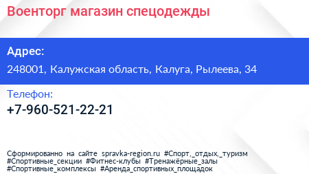 Военторг, магазин спецодежды по адресу 248001, Калужская область, Калуга, Рылеева, 34 в дальнейшем Организация, размещена в следующих категориях: