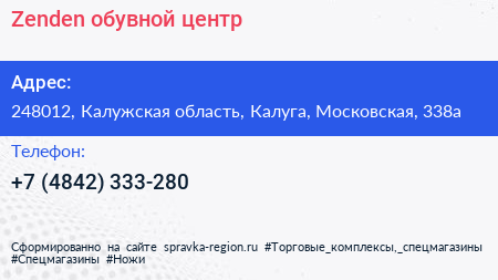 Zenden, обувной центр по адресу 248012, Калужская область, Калуга, Московская, 338а в дальнейшем Организация, размещена в следующих категориях: