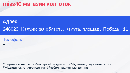miss40, магазин колготок по адресу 248023, Калужская область, Калуга, площадь Победы, 11 в дальнейшем Организация, размещена в следующих категориях: