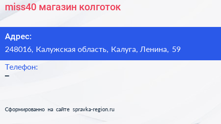 miss40, магазин колготок по адресу 248016, Калужская область, Калуга, Ленина, 59 в дальнейшем Организация, размещена в следующих категориях: