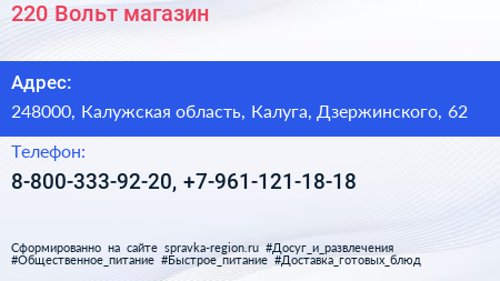 220 Вольт, магазин по адресу 248000, Калужская область, Калуга, Дзержинского, 62 в дальнейшем Организация, размещена в следующих категориях: