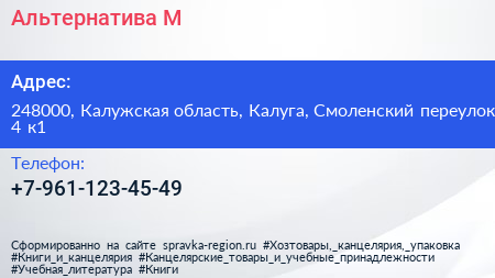 Альтернатива М по адресу 248000, Калужская область, Калуга, Смоленский переулок, 4 к1 в дальнейшем Организация, размещена в следующих категориях: