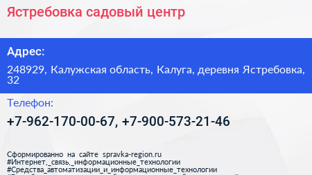 Ястребовка, садовый центр по адресу 248929, Калужская область, Калуга, деревня Ястребовка, 32 в дальнейшем Организация, размещена в следующих категориях: