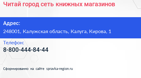 Читай город, сеть книжных магазинов по адресу 248001, Калужская область, Калуга, Кирова, 1 в дальнейшем Организация, размещена в следующих категориях: