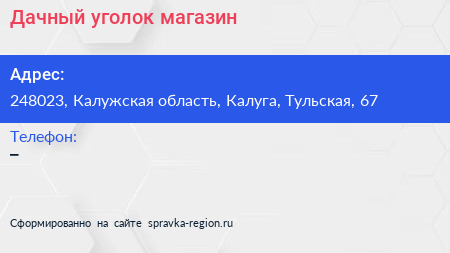 Дачный уголок, магазин по адресу 248023, Калужская область, Калуга, Тульская, 67 в дальнейшем Организация, размещена в следующих категориях: