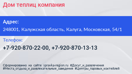 Дом теплиц, компания по адресу 248001, Калужская область, Калуга, Московская, 54/1 в дальнейшем Организация, размещена в следующих категориях: