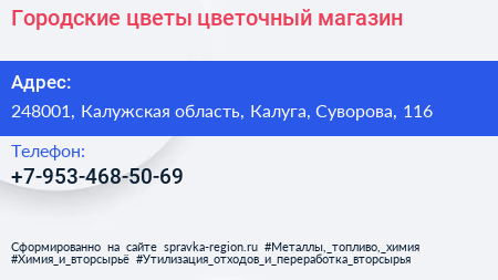 Городские цветы, цветочный магазин по адресу 248001, Калужская область, Калуга, Суворова, 116 в дальнейшем Организация, размещена в следующих категориях: