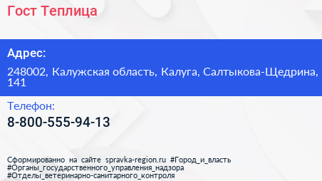 Гост-Теплица по адресу 248002, Калужская область, Калуга, Салтыкова-Щедрина, 141 в дальнейшем Организация, размещена в следующих категориях:
