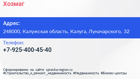 Хозмаг по адресу 248000, Калужская область, Калуга, Луначарского, 32 в дальнейшем Организация, размещена в следующих категориях:
