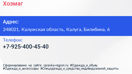 Хозмаг по адресу 248021, Калужская область, Калуга, Билибина, 6 в дальнейшем Организация, размещена в следующих категориях: