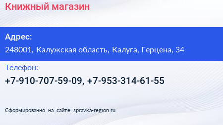 Книжный магазин по адресу 248001, Калужская область, Калуга, Герцена, 34 в дальнейшем Организация, размещена в следующих категориях: