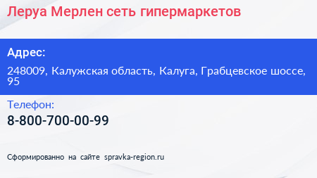 Леруа Мерлен, сеть гипермаркетов по адресу 248009, Калужская область, Калуга, Грабцевское шоссе, 95 в дальнейшем Организация, размещена в следующих категориях: