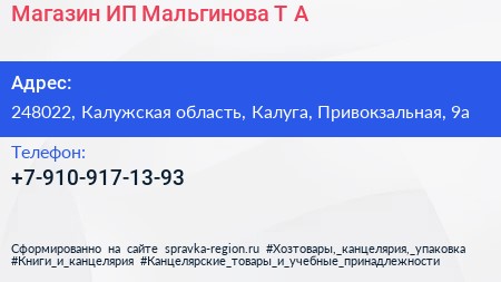 Магазин, ИП Мальгинова Т.А. по адресу 248022, Калужская область, Калуга, Привокзальная, 9а в дальнейшем Организация, размещена в следующих категориях: