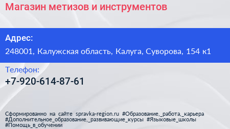 Магазин метизов и инструментов по адресу 248001, Калужская область, Калуга, Суворова, 154 к1 в дальнейшем Организация, размещена в следующих категориях: