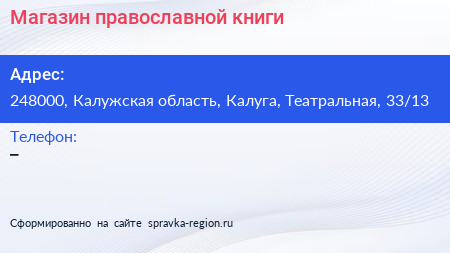 Магазин православной книги по адресу 248000, Калужская область, Калуга, Театральная, 33/13 в дальнейшем Организация, размещена в следующих категориях: