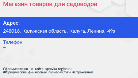Магазин товаров для садоводов по адресу 248016, Калужская область, Калуга, Ленина, 49а в дальнейшем Организация, размещена в следующих категориях: