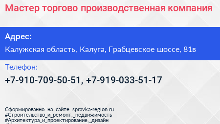 Мастер, торгово-производственная компания по адресу Калужская область, Калуга, Грабцевское шоссе, 81в в дальнейшем Организация, размещена в следующих категориях: