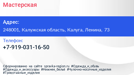 Мастерская по адресу 248001, Калужская область, Калуга, Ленина, 73 в дальнейшем Организация, размещена в следующих категориях: