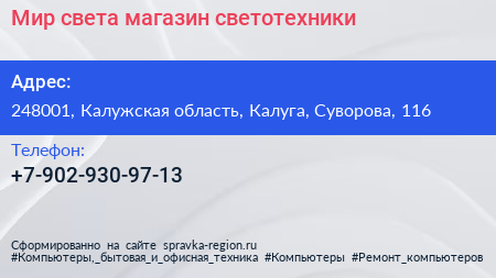 Мир света, магазин светотехники по адресу 248001, Калужская область, Калуга, Суворова, 116 в дальнейшем Организация, размещена в следующих категориях: