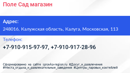 Поле-Сад, магазин по адресу 248016, Калужская область, Калуга, Московская, 113 в дальнейшем Организация, размещена в следующих категориях: