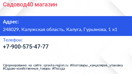 Садовод40, магазин по адресу 248029, Калужская область, Калуга, Гурьянова, 1 к1 в дальнейшем Организация, размещена в следующих категориях: