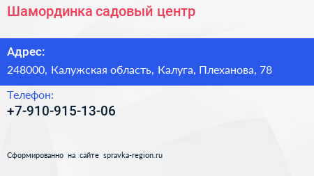 Шамординка, садовый центр по адресу 248000, Калужская область, Калуга, Плеханова, 78 в дальнейшем Организация, размещена в следующих категориях: