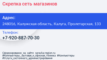 Скрепка, сеть магазинов по адресу 248016, Калужская область, Калуга, Пролетарская, 133 в дальнейшем Организация, размещена в следующих категориях:
