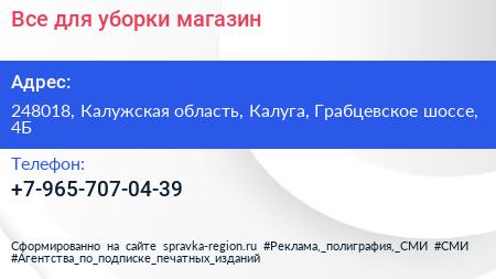 Все для уборки, магазин по адресу 248018, Калужская область, Калуга, Грабцевское шоссе, 4Б в дальнейшем Организация, размещена в следующих категориях: