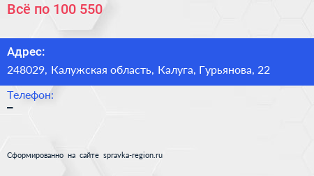 Всё по 100/550 по адресу 248029, Калужская область, Калуга, Гурьянова, 22 в дальнейшем Организация, размещена в следующих категориях: