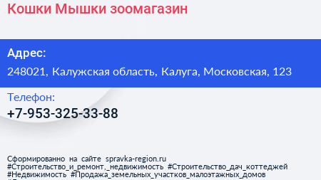 Кошки & Мышки, зоомагазин по адресу 248021, Калужская область, Калуга, Московская, 123 в дальнейшем Организация, размещена в следующих категориях: